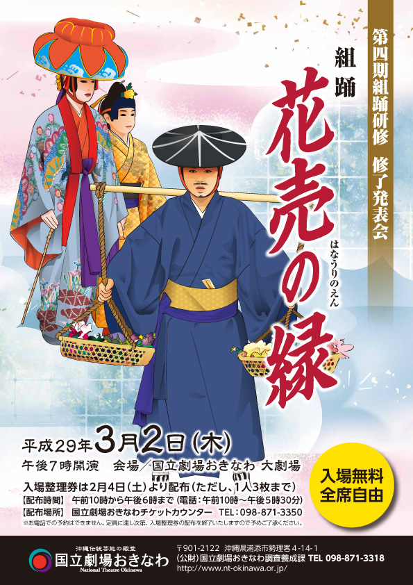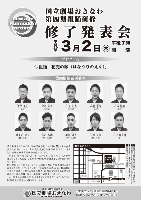 将来の組踊の伝承者を養成するために、国立劇場おきなわでは組踊研修を実施しています。平成26年4月より、10名が第四期組踊研修生として研修に励んでいます。今回の修了発表会は、第四期生にとって3年間の研修の集大成となる公演です。是非一人でも多くの方にご覧いただきたいと思っております。