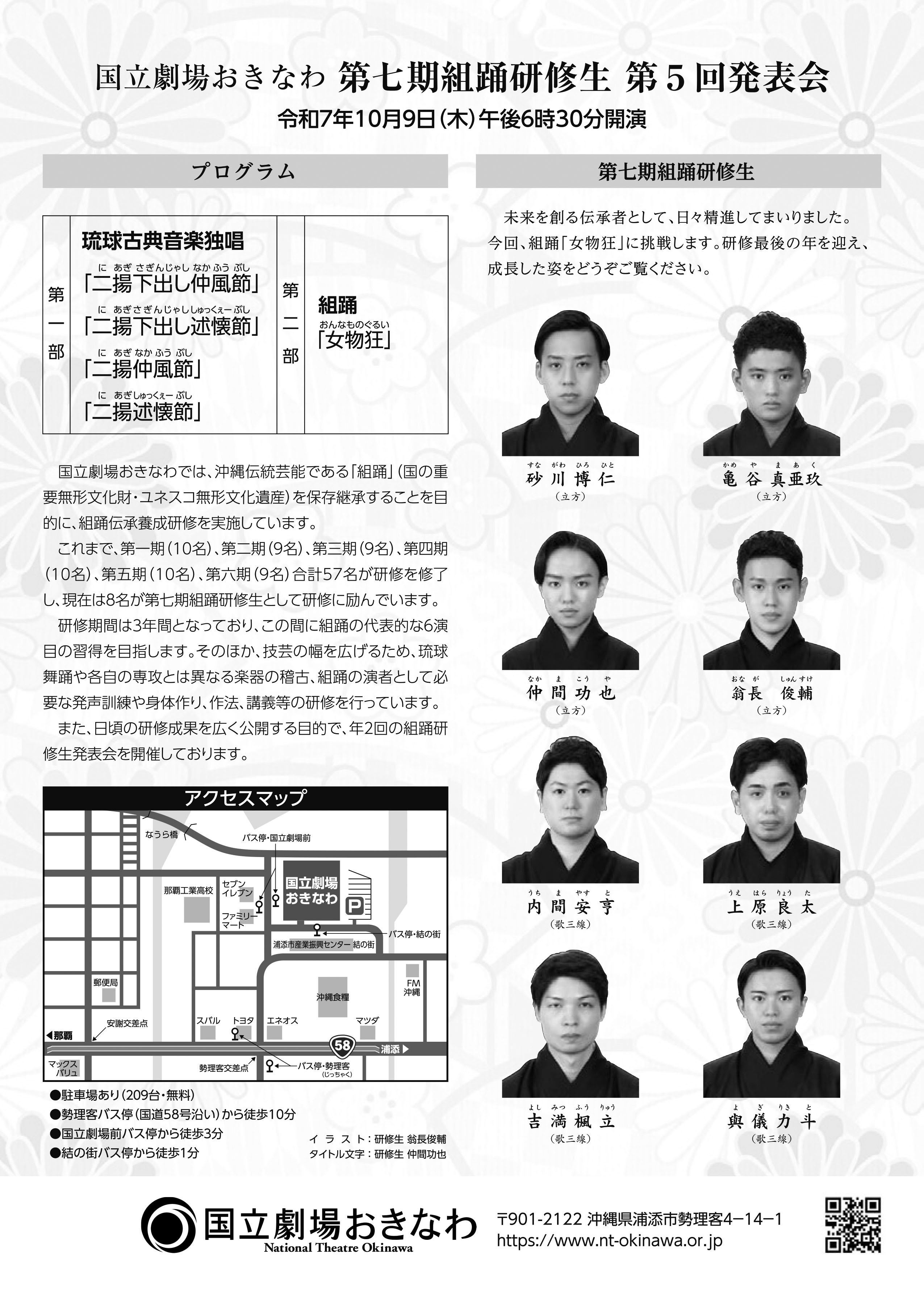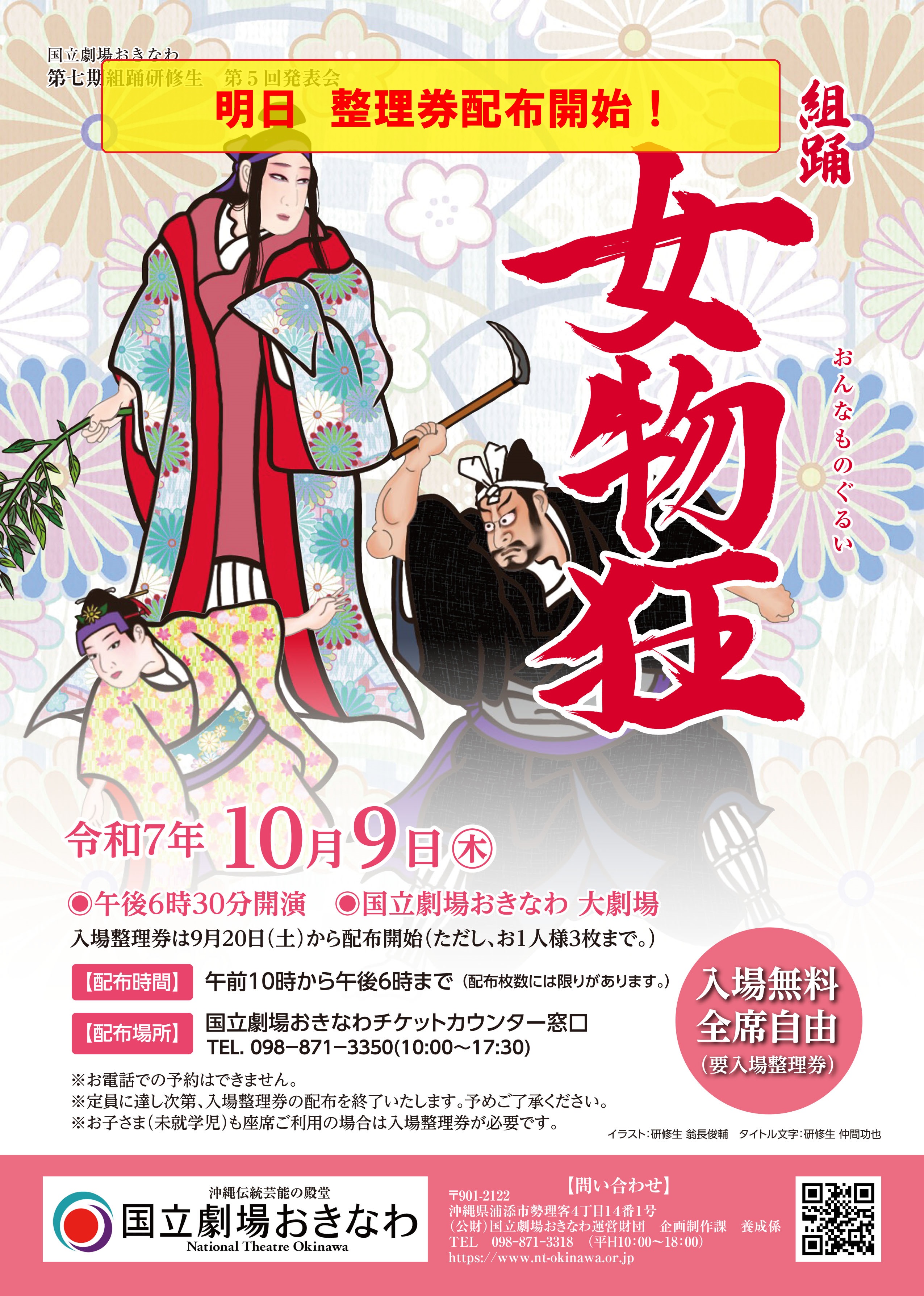 令和7年10月9日(木)に開催される第七期組踊研修生第5回発表会組踊「女物狂」の整理券配布が明日の9月20日(土)10時より開始されます。