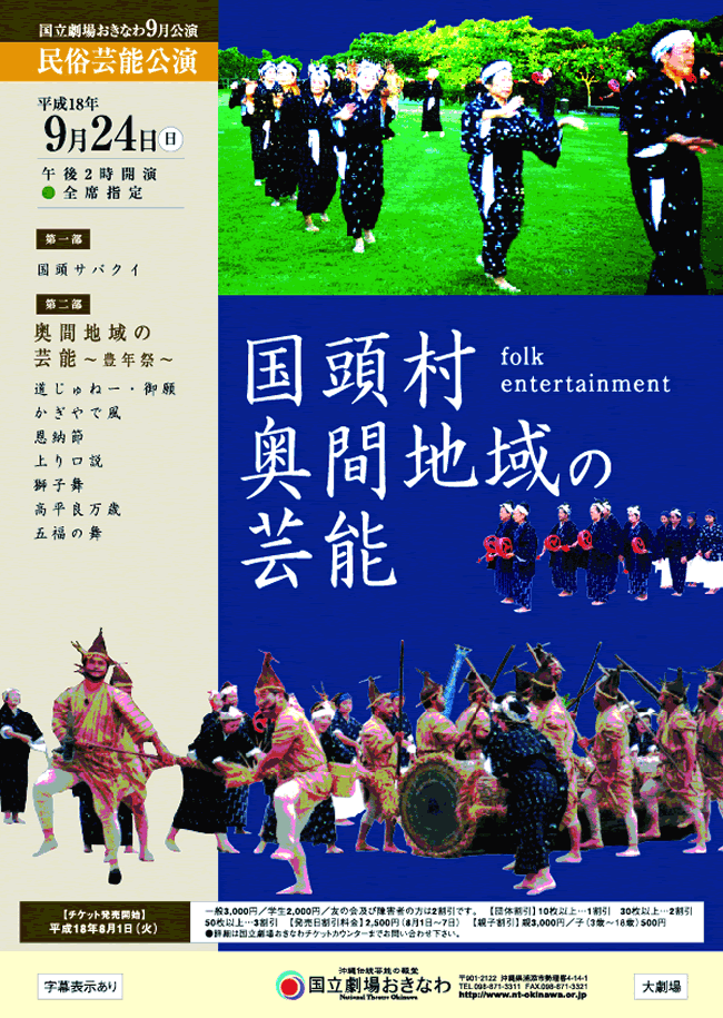 国立劇場おきなわでは、沖縄県内の民俗芸能の保存継承を図るため、地域単位で民俗芸能を公開しています。今回は、国頭地区から奥間地域の民俗芸能を紹介します。