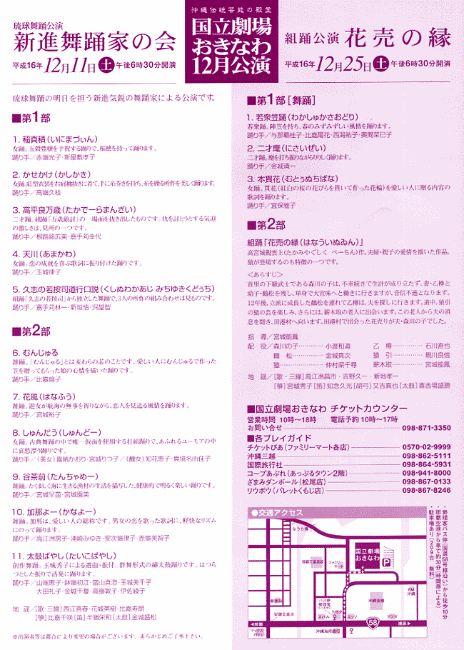 琉球舞踊の明日を担う新進気鋭の舞踊家による公演です。 -演目- 第1部 |