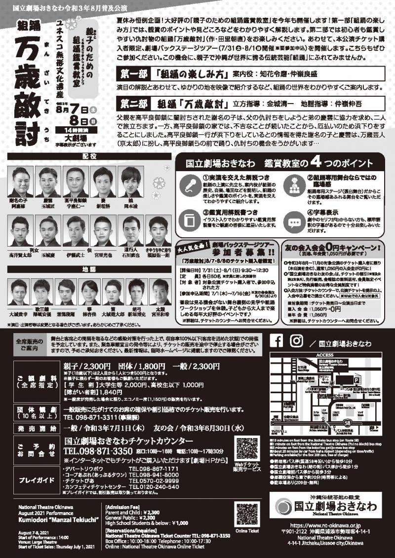 「特措法に基づく緊急事態措置に係る沖縄県対処方針」を受け、やむなく公演を中止することといたしました。 -演目- 【第一部】 |