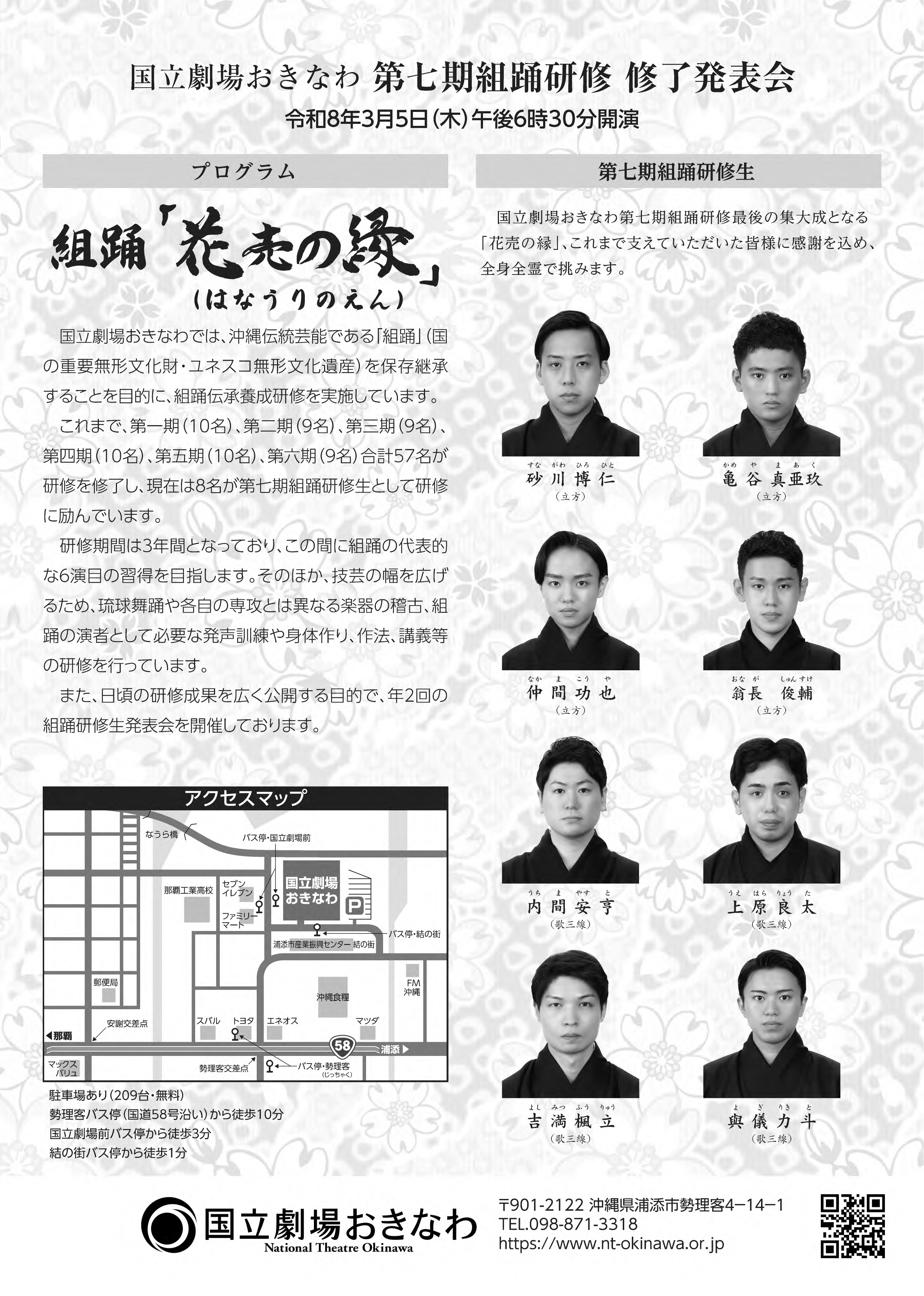 国立劇場おきなわ第七期組踊研修最後の集大成となる「花売の縁」、これまで支えていただいた皆様に感謝を込め、全身全霊で挑みます。 -演目- 組踊「花売の縁」 |