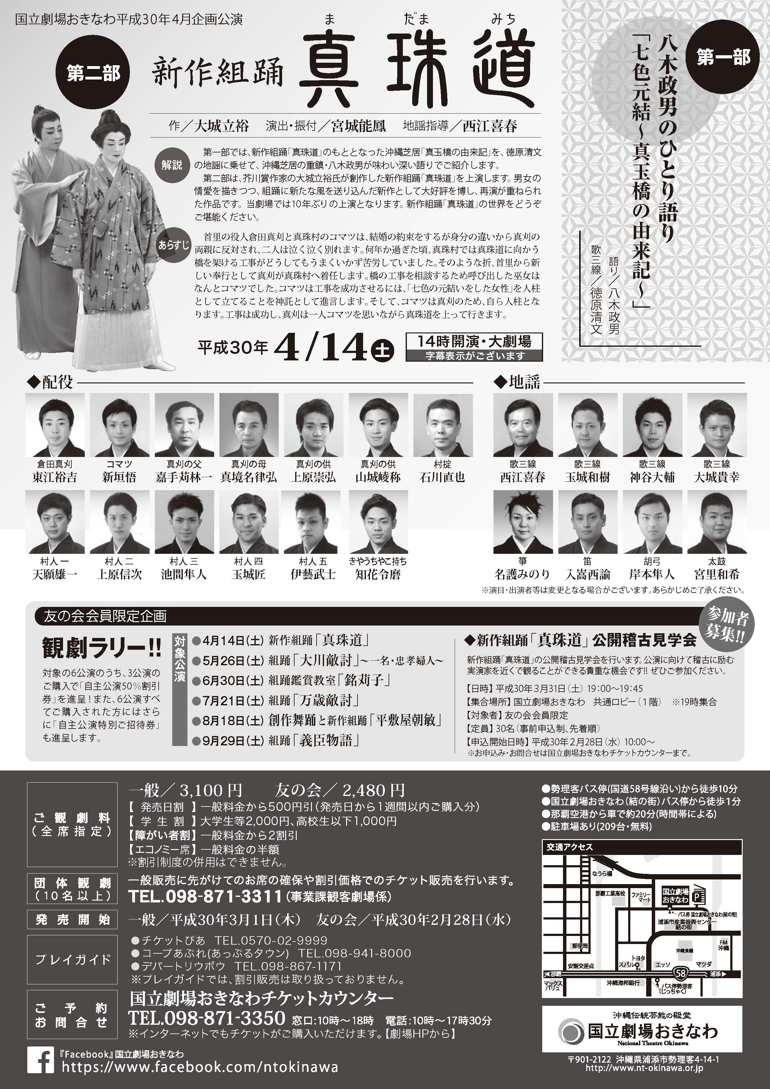 #1 出演者の変更・・・第二部歌三線「神谷大輔」を「花城英樹」に変更(H30.2.27) #2 出演者の追加・・・第一部に「太鼓/髙宮城実人」を追加 (H30.3.13) #3 出演者の変更・・・第二部胡弓「岸本隼人」を「髙宮城実人」に変更(H30.3.13) ※演目・出演者等は都合により変更になる場合がございます。あらかじめご了承ください。 公演詳細はこちら