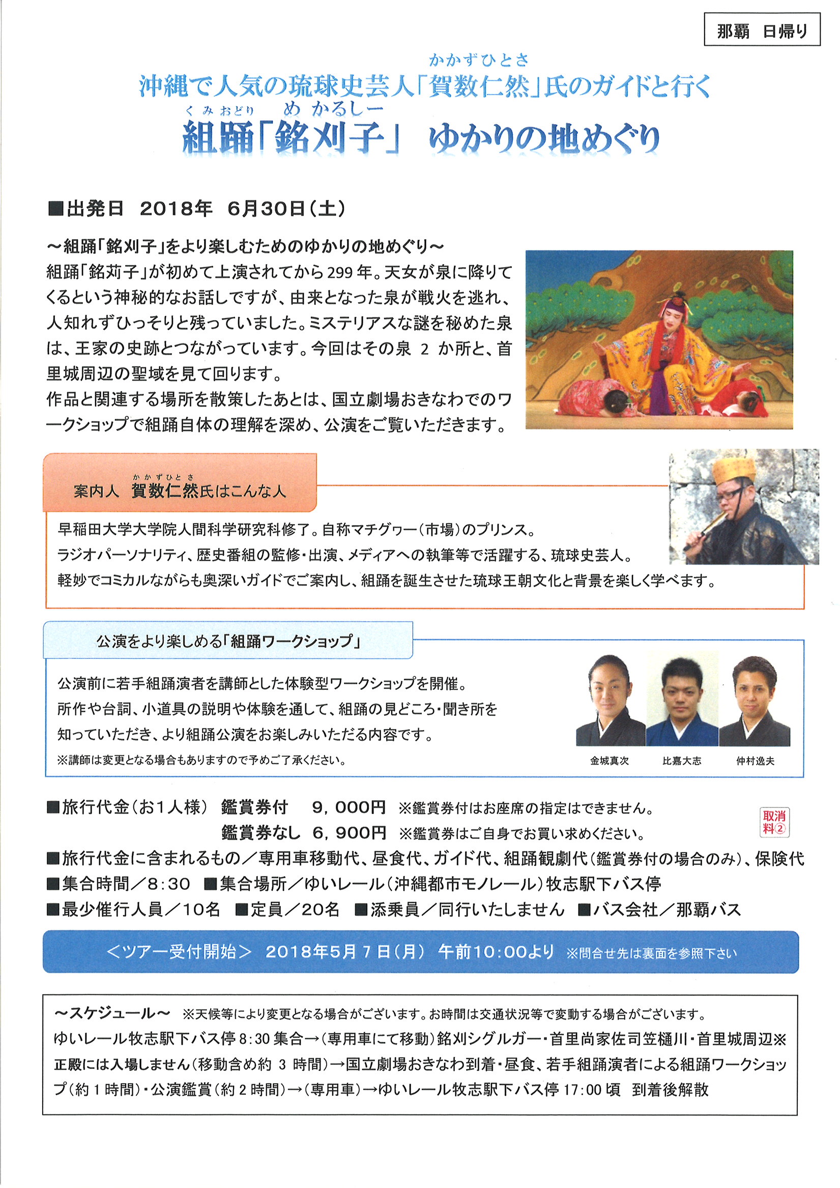 ゆかりの地を訪ねた後は、人気実演家による組踊ワークショップで組踊の所作や、見どころ聞きどころを楽しく学んでいただき、当劇場で本作品をご堪能いただきます。 皆様のご参加をお待ち申し上げております。 【ツアー開催日】