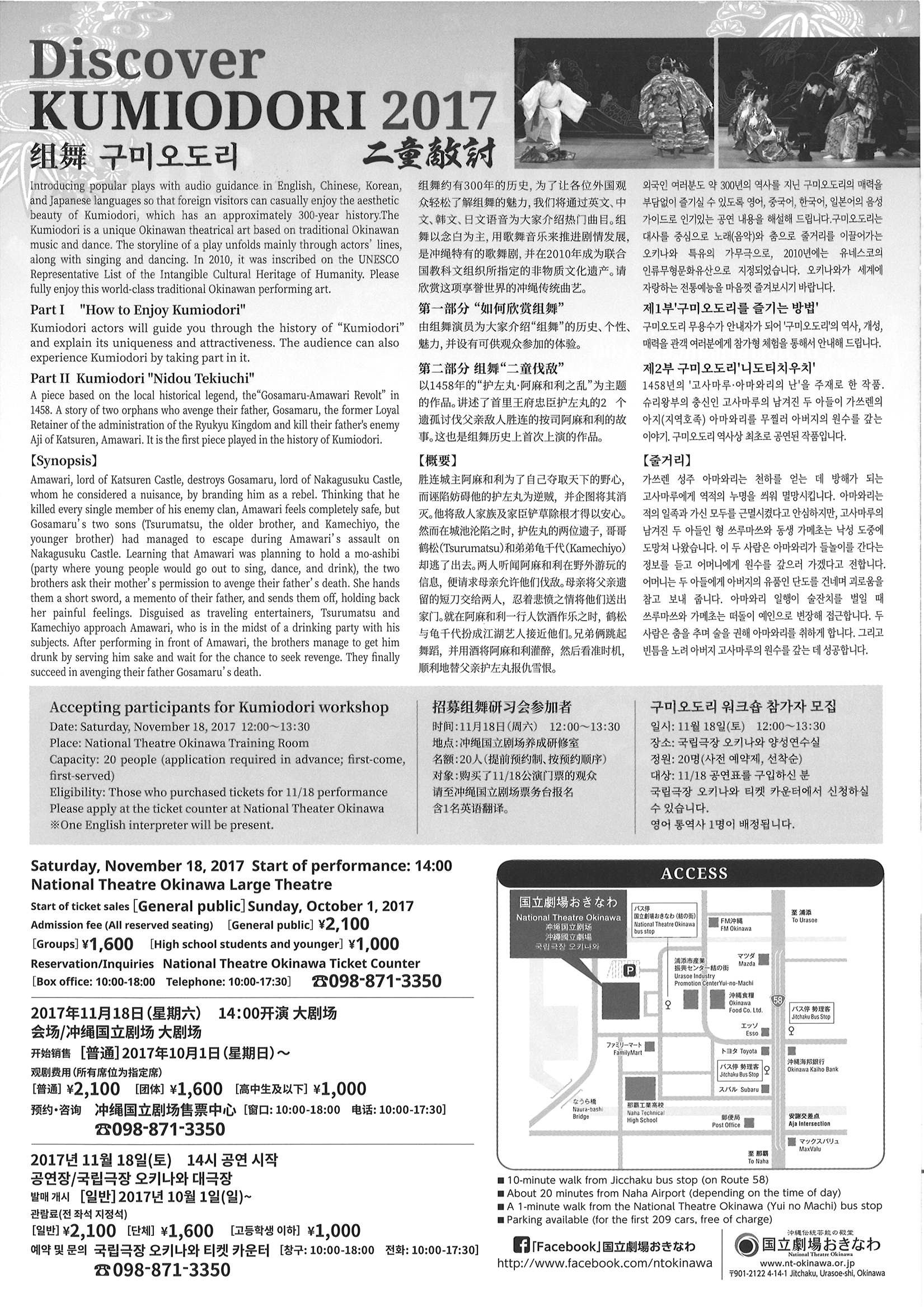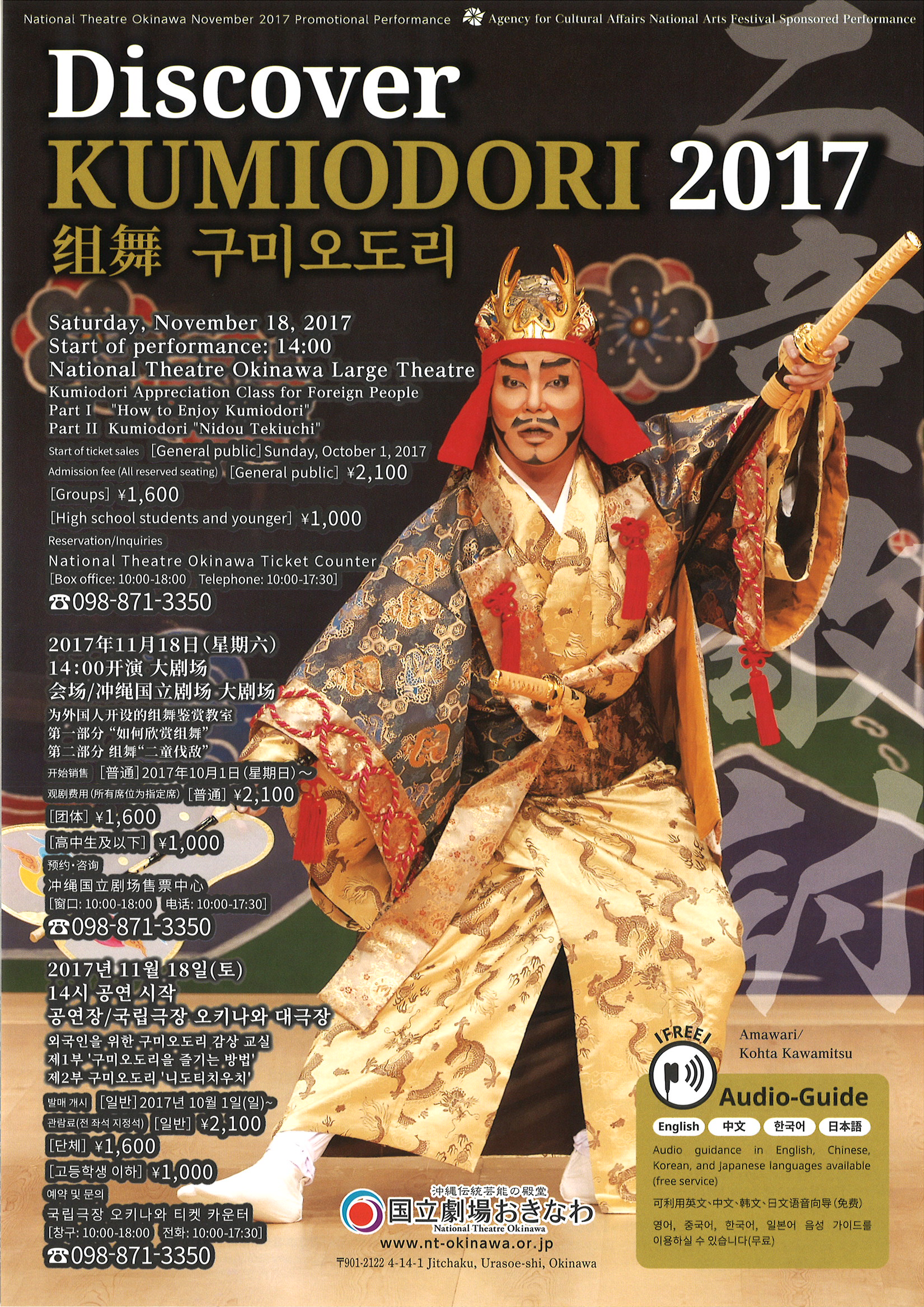 沖縄が世界に誇る伝統芸能「組踊」(ユネスコ無形文化遺産、国指定重要無形文化財)を外国人の皆様にも気軽に親しんでいただけるよう、英語、中国語、韓国語、日本語の無料オーディオガイド付きで上演します。