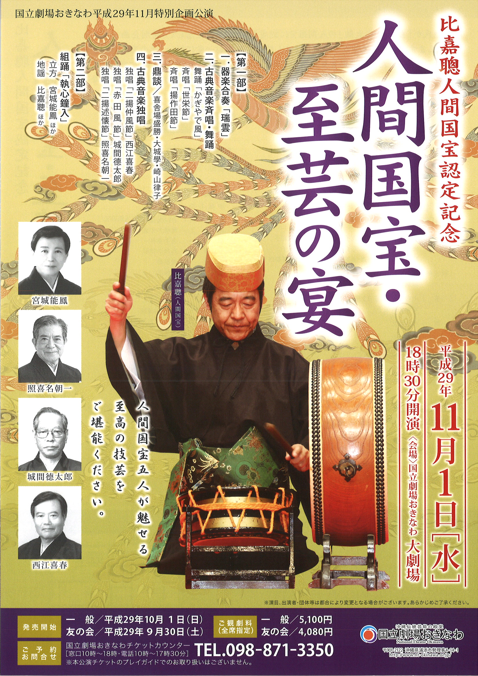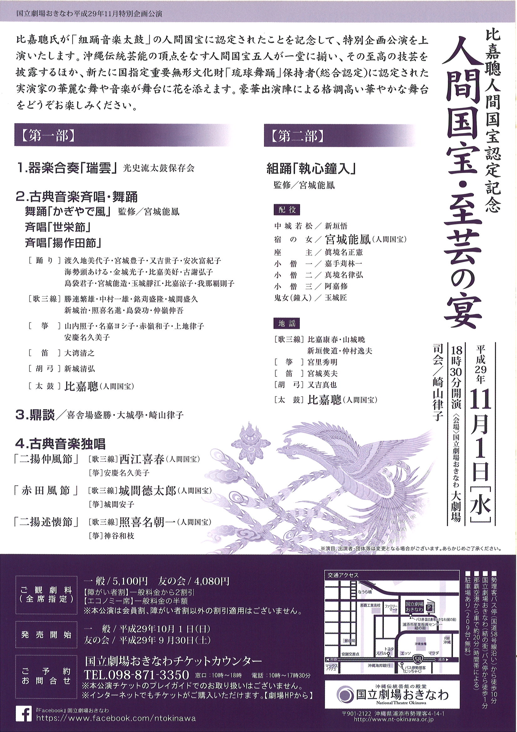 (#1)演目の順序変更・・・第一部古典音楽独唱の演目順「二揚仲風節→赤田風節」を「赤田風節→二揚仲風節」に変更(H29.10.27) (#2)出演者の降板・・・第一部「かぎやで風」の「宮城豊子」降板(H29.11.1) ※演目・出演者等は都合により変更になる場合がございます。あらかじめご了承ください。