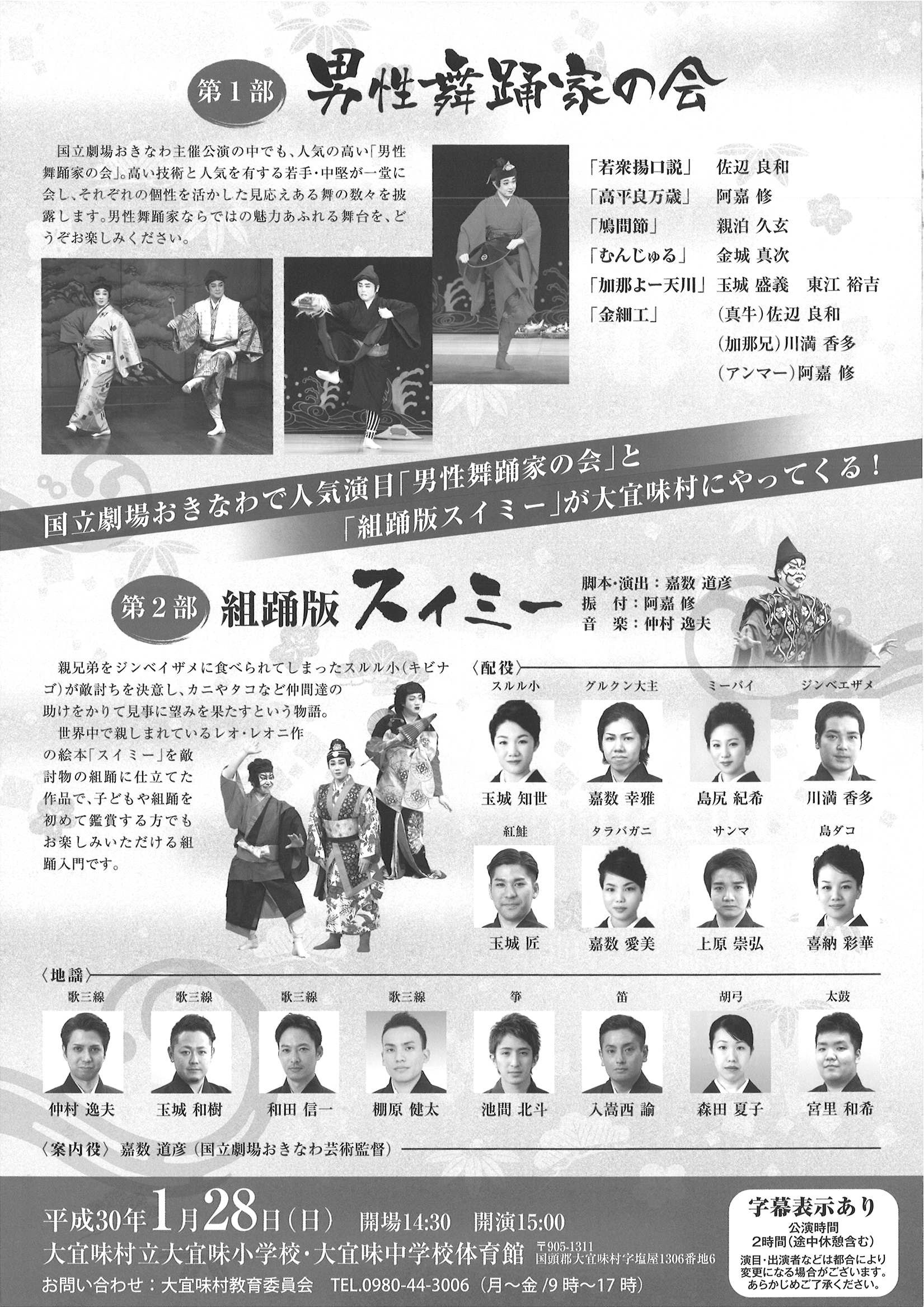公演日時:平成30年1月28日(日) 午後3時開演 場 所:大宜味村立大宜味小学校・大宜味中学校体育館(大宜味村字塩屋1306番地6)