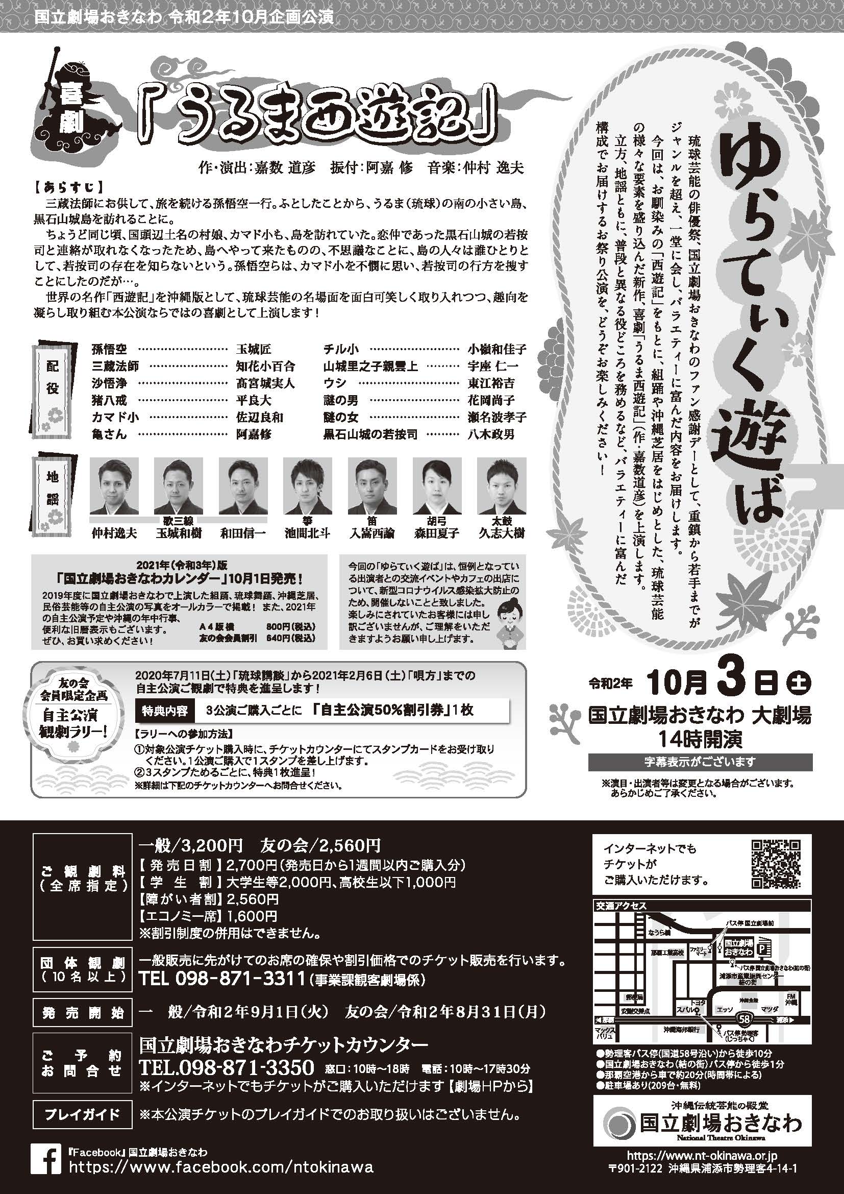 三蔵法師にお供して、旅を続ける孫悟空一行。ふとしたことから、うるま(琉球)の南の小さい島、黒石山城島を訪れることに。 ちょうど同じ頃、国頭辺土名村娘、カマド小も、島を訪れていた。恋仲であった黒石山城の若按司と連絡が取れなくなったため、島へやって来たものの、不思議なことに、島の人々は誰ひとりとして、若按司の存在を知らないという。孫悟空らは、カマド小を不憫に思い、若按司の行方を捜すことにしたのだが・・・。 世界の名作「西遊記」を沖縄版として、琉球芸能の名場面を面白可笑しく取り入れつつ、趣向を凝らし取り組む本公演ならではの喜劇として上演します! 【配役】 孫悟空 : 玉城 匠 三蔵法師 : 知花 小百合 沙悟浄 : 髙宮城 実人 猪八戒 : 平良 大 カマド小 : 佐辺 良和 亀さん : 阿嘉 修 チル小 : 小嶺 和佳子 山城里之子親雲上 : 宇座 仁一 ウシ : 東江 裕吉 謎の男 : 花岡尚子 謎の女 : 瀬名波 孝子 黒石山城の若按司 : 八木 政男 【地謡】