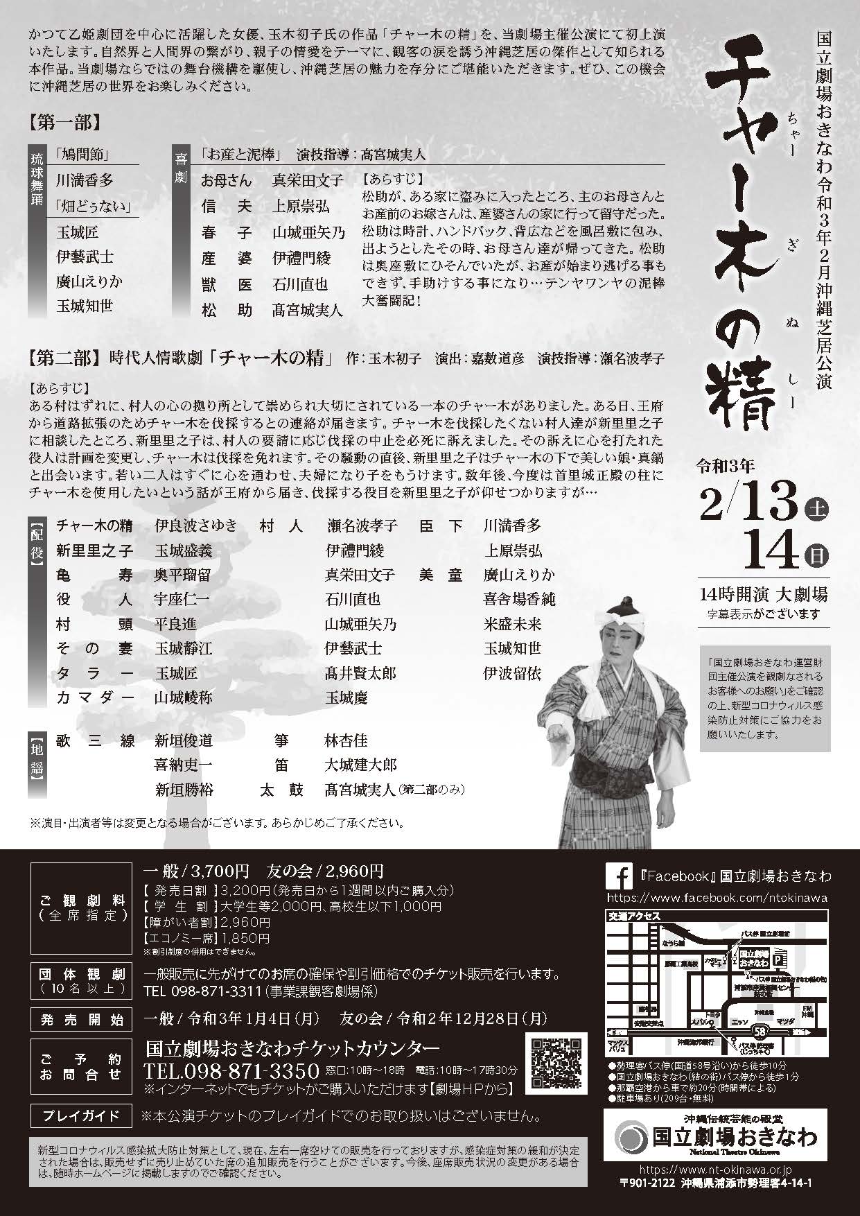 琉球舞踊 「鳩間節」 川満 香多 「畑どぅない」 玉城 匠 伊藝 武士 廣山 えりか 玉城 知世 喜劇 「お産と泥棒」 演技指導 : 髙宮城 実人 (あらすじ) 松助が、ある家に盗みに入ったところ、主人のお母さんとお産前のお嫁さんは、産婆さんの家に行って留守だった。松助は時計、ハンドバック、背広などを風呂敷に包み、出ようとしたその時、お母さん達が帰ってきた。松助は奥座敷にひそんでいたが、お産が始まり逃げる事もできず、手助けする事になり…テンヤワンヤの泥棒大奮闘記! (配役) お母さん : 真栄田 文子 信夫 : 上原 崇弘 春子 : 山城 亜矢乃 産婆 : 伊禮門 綾 獣医 : 石川 直也 松助 : 髙宮城 実人 【第二部】 「チャー木の精」 作 : 玉木 初子 演出 : 嘉数 道彦 演技指導 : 瀬名波 孝子 (あらすじ) ある村はずれに、村人の心の拠り所として崇められ大切にされている一本のチャー木がありました。ある日、王府から道路拡張のためチャー木を伐採するとの連絡が届きます。チャー木を伐採したくない村人達が新里里之子に相談したところ、新里里之子は、村人の要請に応じ伐採の中止を必死に訴えました。その訴えに心を打たれた役人は計画を変更し、チャー木は伐採を免れます。その騒動の直後、新里里之子はチャー木の下で美しい娘・真鍋と出会います。若い二人はすぐに心を通わせ、夫婦になり子をもうけます。 数年後、今度は首里城正殿の柱にチャー木を使用したいという話が王府から届き、伐採する役目を新里里之子が仰せつかりますが… (配役) チャー木の精 : 伊良波 さゆき 新里里之子 : 玉城 盛義 亀寿 : 奥平 瑠留 役人 : 宇座 仁一 村頭 : 平良 進 その妻 : 玉城 靜江 タラー : 玉城 匠 カマダー : 山城 崚称 村人 : 瀬名波 孝子 伊禮門 綾 真栄田 文子 石川 直也 山城 亜矢乃 伊藝 武士 髙井 賢太郎 玉城 慶 臣下 : 川満 香多 上原 崇弘 美童 : 廣山 えりか 喜舎場 香純 米盛 未来 玉城 知世 伊波 留依 【地謡】 歌三線: 新垣 俊道 喜納 吏一 新垣 勝裕 箏 : 林 杏佳 笛 : 大城 建大郎 太鼓 : 髙宮城 実人(第二部のみ) ※演目・出演者等は変更となる場合がございます。あらかじめご了承ください。