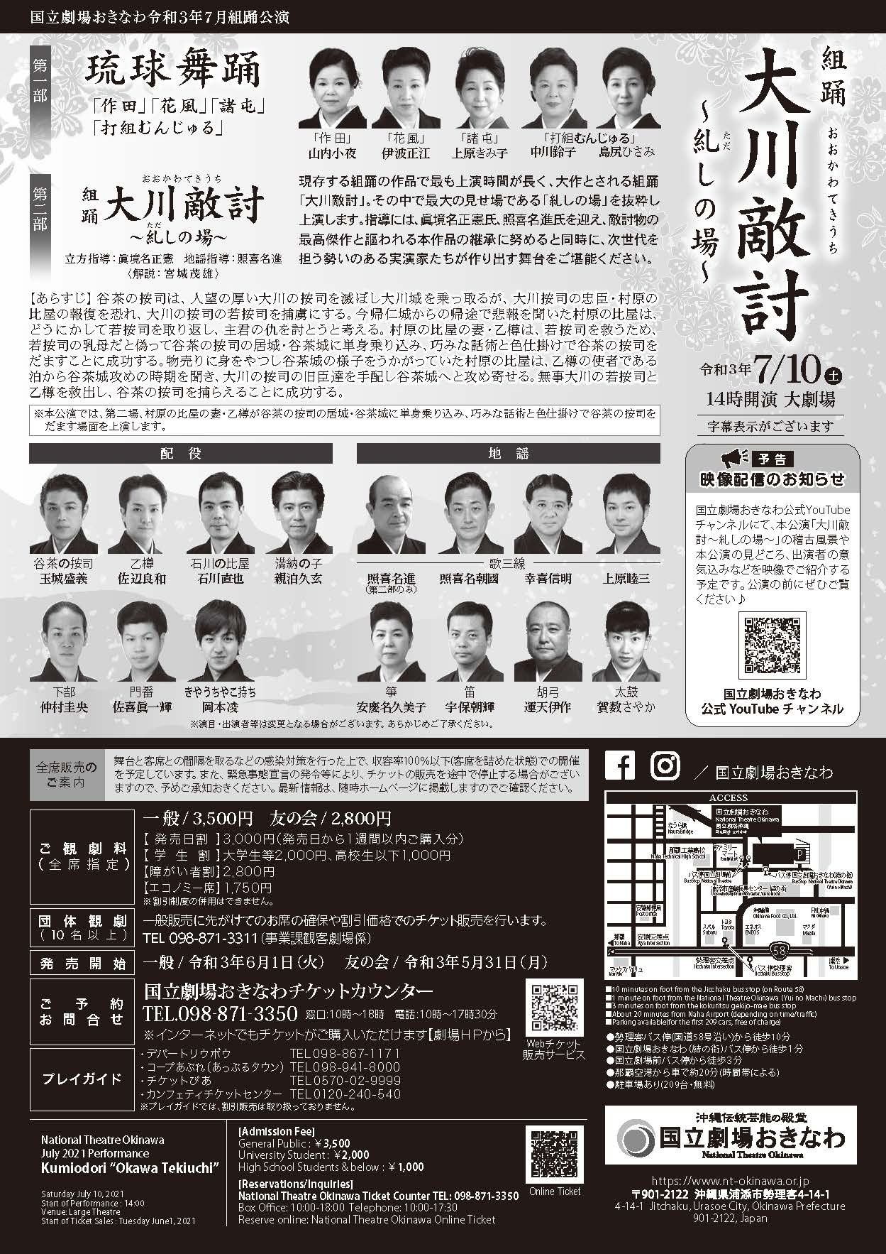 現存する組踊の作品で最も上演時間が長く、大作とされる組踊「大川敵討」。その中で最大の見せ場である「糺しの場」を抜粋し上演します。指導には、眞境名正憲氏、照喜名進氏を迎え、敵討物の最高傑作と謳われる本作品の継承に努めると同時に、次世代を担う勢いのある実演家たちが作り出す舞台をご堪能ください。