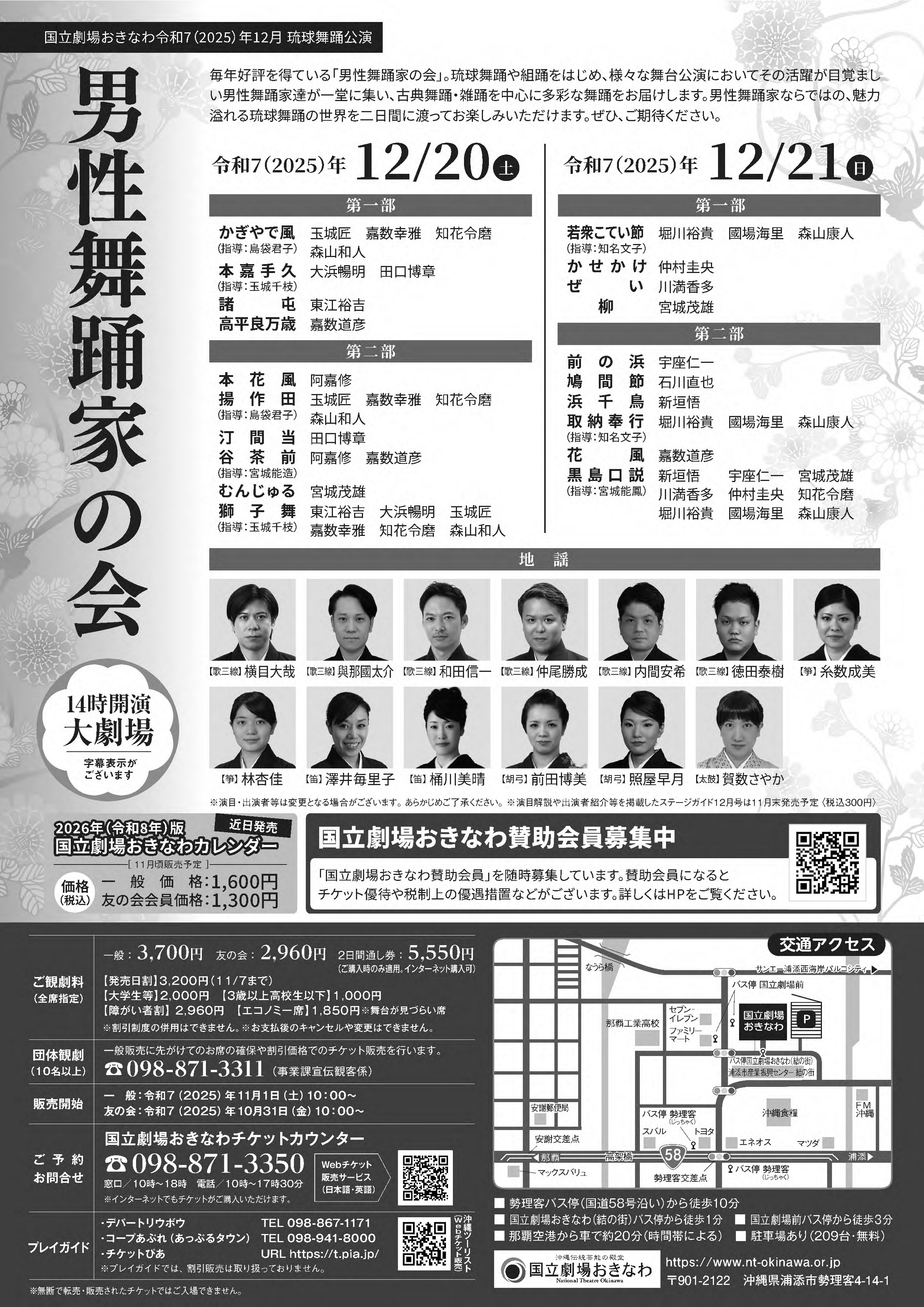 【ご予約・お問合せ】 国立劇場おきなわチケットカウンター TEL.098-871-3350 電話:10時~17時30分 窓口:10時~18時 |