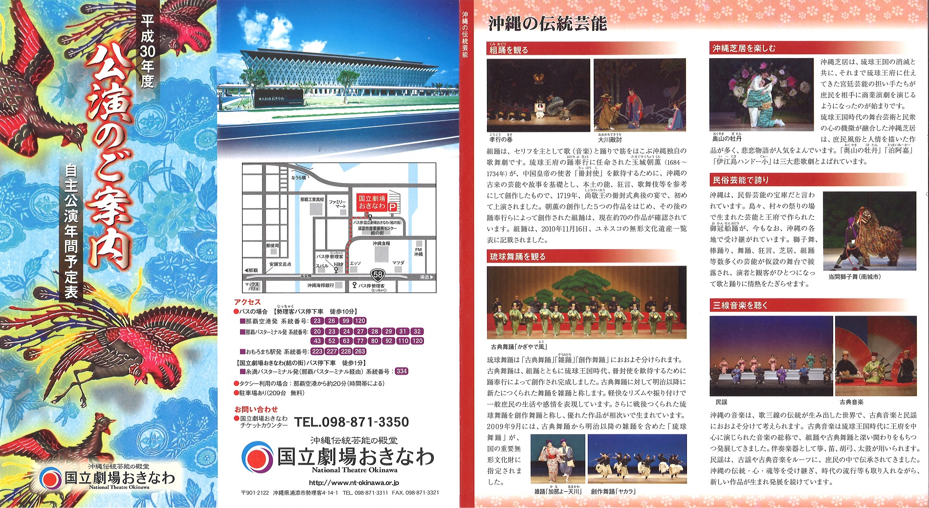 国立劇場おきなわでは、平成30年度もユネスコ無形文化遺産「組踊」、国指定重要無形文化財「琉球舞踊」をはじめ、三線音楽、沖縄芝居、民俗芸能などのバラエティーに富んだ公演を予定しています。