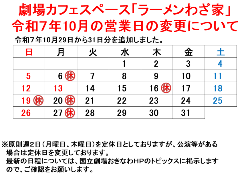 「ラーメンわざ家」令和7年10月の営業日の変更について